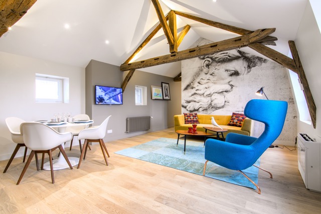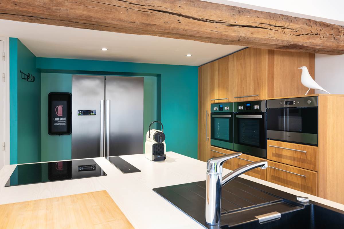 It is the smallest but very comfortable. This mini apartment with its maxi kitchen is situated under the roofs on the second floor. A contrasti dng ecoration with black and turquoise creates an enveloping space conducive to privacy. It is composed of a main room where you will be able to prepare and take meals thanks to its equipped kitchen (fridge, induction plates, hood, multi-function oven, tableware and utensils.